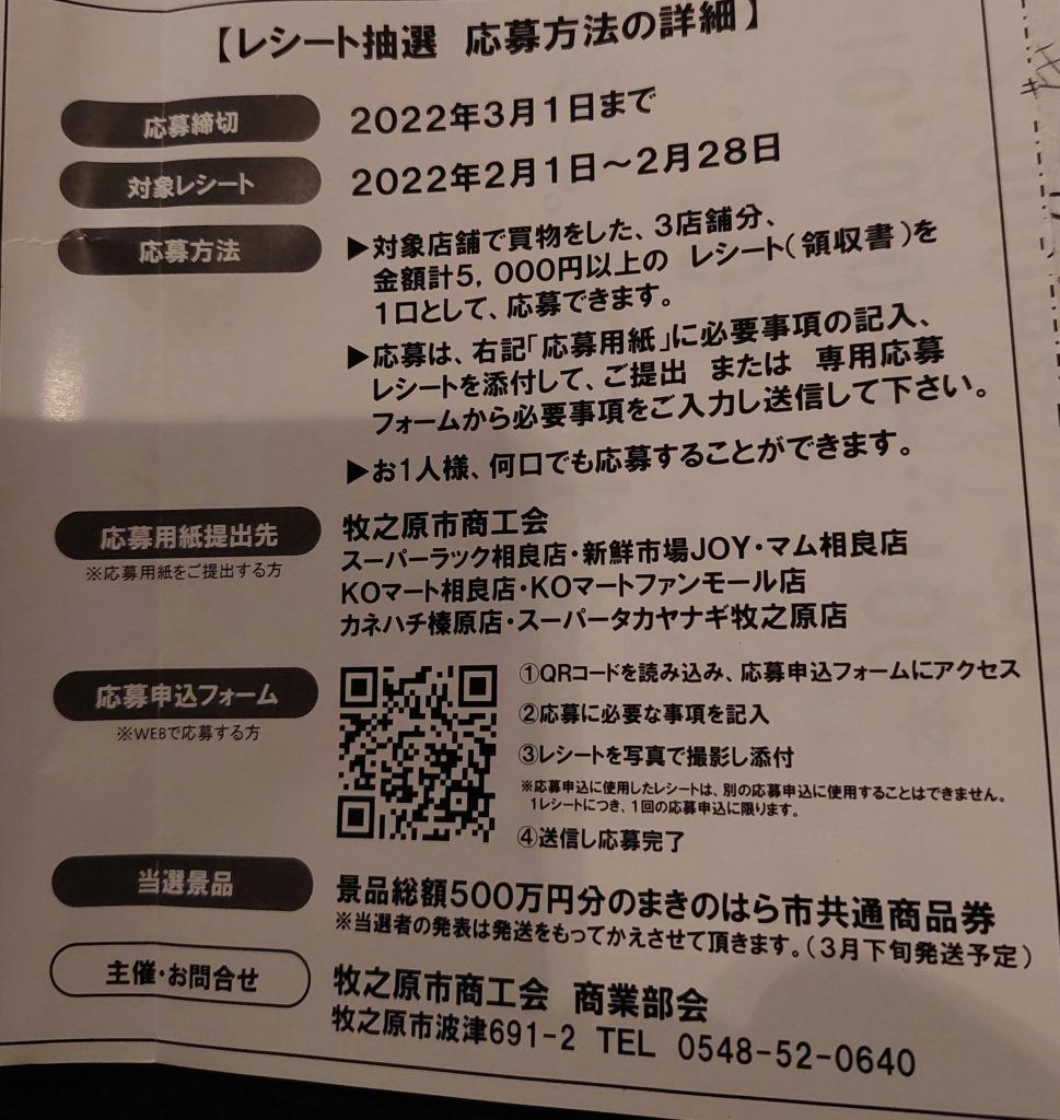 応募方法◎牧之原市の対象店舗でお買い物をした、3店舗分、金額合計5.000円以上のレシート(アカラでは領収書)を1口として、応募できます。